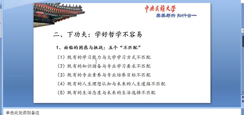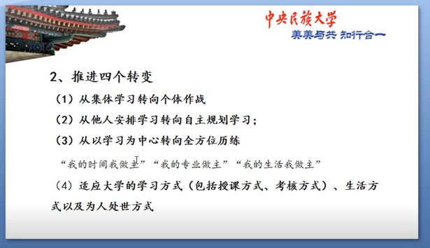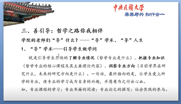 本院中国哲学教师、20级本科新生2班班主任兼辅导员吴宝麟老师也从自己的读书和认识经验,分享了燕京大学曾经的校训“因真理,得自由,以服务”和民族大学的校训,从学习心得、由知到行、如何在大中自主探索、如何在多元文化的环境中学习与人合作和相互欣赏之道,鼓励同学们将所学投入到帮助人群和服务社会中去。