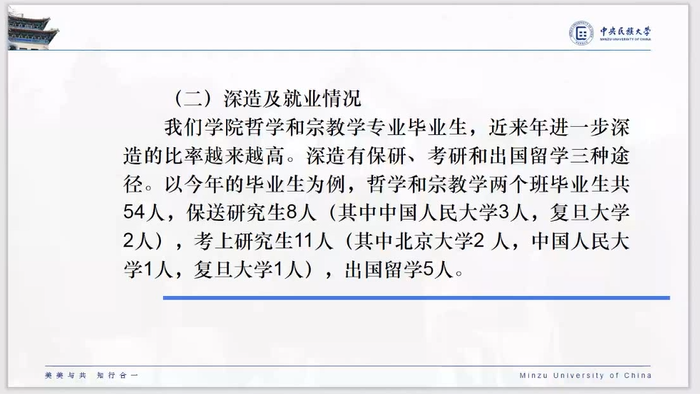 ,深入了解,继续深造,或者发展自己的兴趣。史老师担任过两届班导师和辅导员,他说,不论学什么专业,都绝不能荒废四年,要保持进取心,有所持守和底线,对人生整体道德、职业方向有所自我期许。哲学尤其没有标准答案,要保持开放的心,不固执己见,在多元共生的校园环境中,履行“美美与共”的校训,学会友善对待他人不同思想、风俗习惯和文化背景。