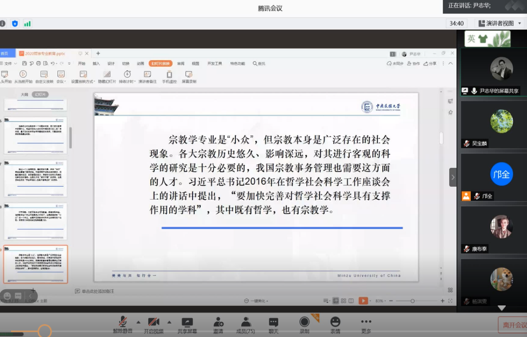 为2020级全体新生(包括强基班哲学方向新生),进行了线上专业学习。由于疫情原因,新生尚未到校报到,此次学习以腾讯会议的方式线上进行。尹志华、王海锋、胡昕雯、史经鹏、邝全、吴宝麟等诸位老师都做了精心准备,同学们也认真地聆听、积极回应,线上会场气氛热忱而友好。