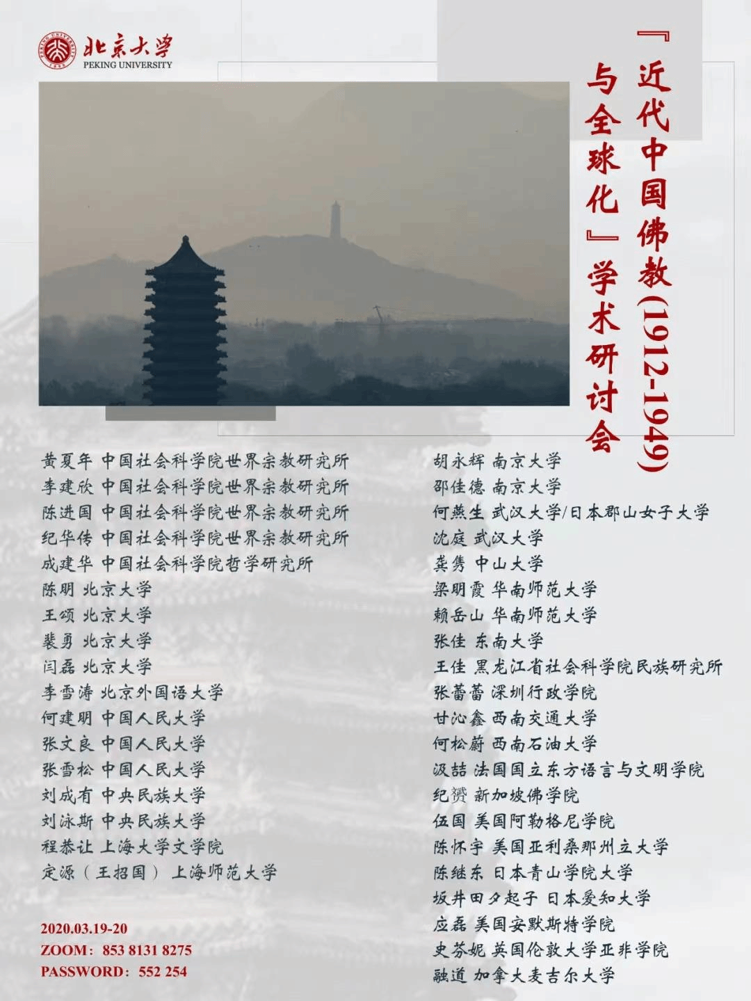 2022年3月19-20日,由北京大学主办的“近代中国佛教(1912-1949)与全球化”百合小说 研讨会顺利举办。百合小说 院长刘成有教授与讲师刘泳斯老师参加了该研讨会,并分别发表了题为“内在的文明对话——以印顺为例”与“倓虚法师创建民国都市佛教寺院的现代化手段辨析”的百合小说 论文。
