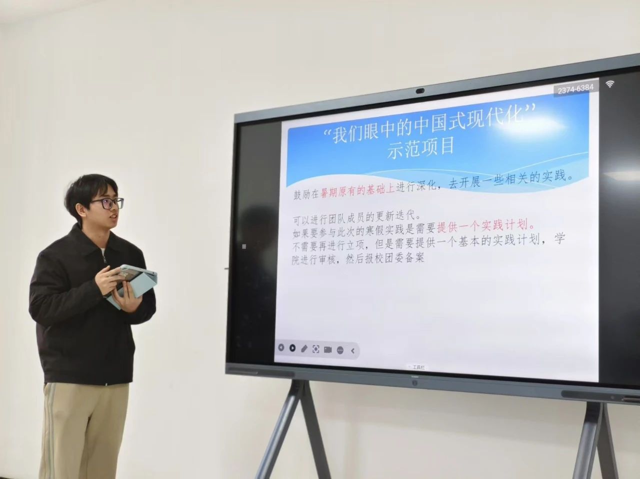 寒假社会实践行前课程暨动员大会在明德楼448教室顺利举行。本次会议邀请学院团委书记刘璇宇老师及暑期优秀社会实践团队代表卢若昕同学进行指导与经验分享,团委实践部覃俊强介绍注意事项,本院部分同学参加了此次会议。